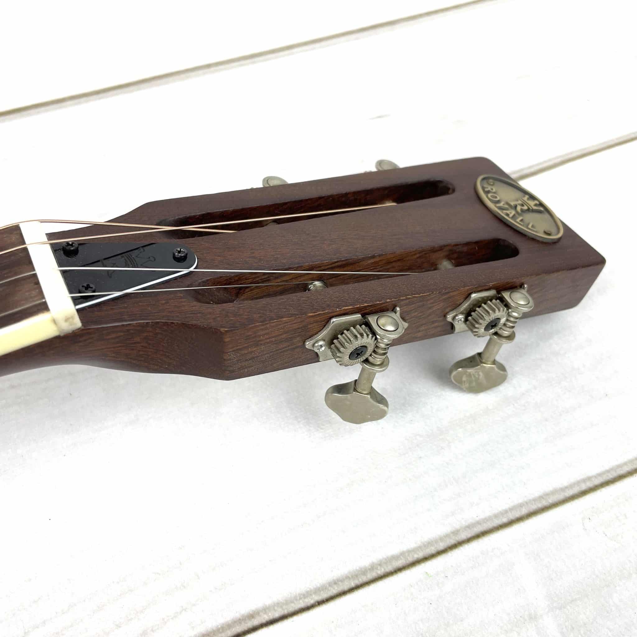 Well, here’s a new addition to the Royall Resonator family. We sometimes have conversations with people who have great ideas for new models for us. We decided to take a stab at this one because of a few persistent people who are pretty sure the world needs TENOR resonators. We’ll soon find out. We chose to go with a parlor body classic single cone style for this model. Giving it a 25″ scale length brings it into the Long Scale category in the tenor world. With multiple lower tunings available for the long scale, and a parlor size rich sounding brass resonator body, this model is quite unique in the world of tenors.