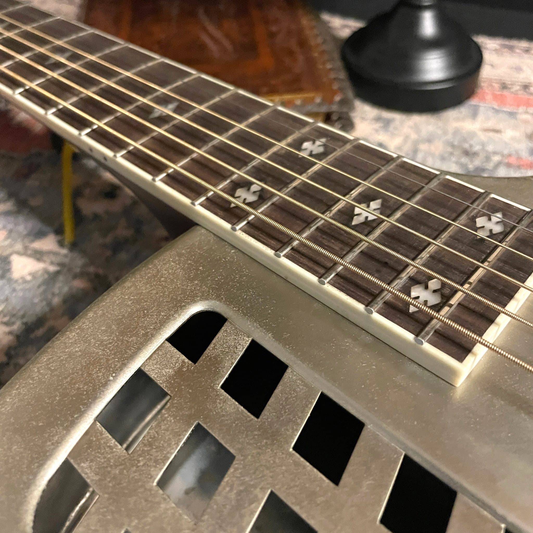 The Trifecta is our 14 fret tricone model in the Royall Resonator family. Based on the classic National Style 1, it has that distinctive tricone sustain and creamy tone. All of our resonators go through a 20 point inspection by our skilled guitar techs before shipment. After inspection, and or adjustment, we double polish the frets, condition the fingerboard, stretch the strings, and tune to pitch. Giving you a wonderfully smooth action and playability right out of the box.